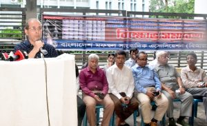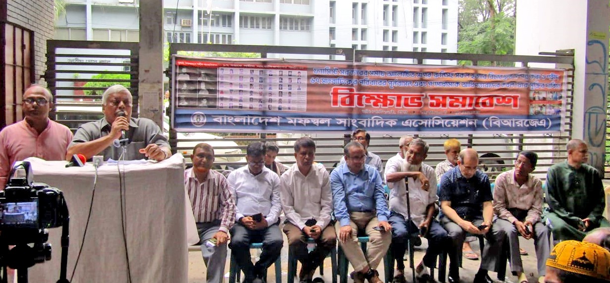 ৪ আগস্ট সোমবার সকাল ১১টায় জাতীয় প্রেসক্লাবের সামনে বাংলাদেশ মফস্বল সাংবাদিক এ্যাসোসিয়েশন (বিআরজেএ) চেয়ারম্যান মোহাম্মদ সাখাওয়াৎ হোসেন ইবনে মঈন চৌধুরীর সভাপতিত্বে ও মহাসচিব শেখ মোহাম্মদ তাজুল ইসলাম এর সঞ্চালনায় বিক্ষোভ সমাবেশ অনুষ্ঠিত হয়।